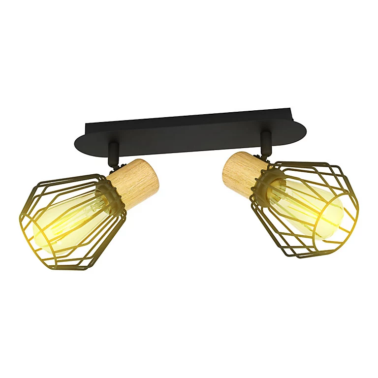 - La barre de 2 spots Palmora se compose d’un socle en acier noir, et de deux abat jour en acier noir avec une touche de bois.